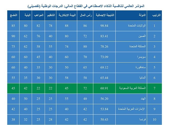 حققت كل من السعودية والإمارات إنجازاً عالمياً جديداً بعد دخولهما قائمة أفضل 10 دول عالمياً في مؤشر التنافسية العالمي للذكاء الاصطناعي في القطاع المالي، الصادر عن مجموعة المعرفة العميقة (Deep Knowledge Group)، بالتعاون مع مجلس تطوير الخدمات المالية (FSDC) في هونغ كونغ بصفته جهة مراقبة مستقلة.