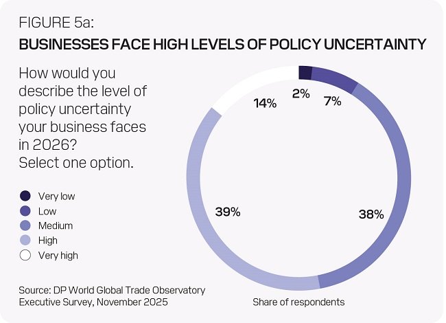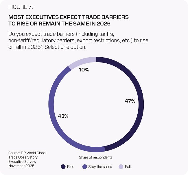 أظهرت البيانات أن 54% من المشاركين يتوقعون تسارع نمو التجارة في 2026 مقارنة بعام 2025، بينما يرى 40% أن النمو سيبقى عند مستواه الحالي. ويأتي هذا التفاؤل رغم توقع 53% من القادة التنفيذيين استمرار مستويات مرتفعة من عدم اليقين في السياسات، وتوقع 90% منهم زيادة العوائق التجارية أو بقائها على حالها. وفي المقابل، لا يتوقع سوى 25% تأثيراً سلبياً مباشراً على أعمالهم، بينما يرى 49% عدم وجود تأثير، و26% تأثيراً إيجابياً.