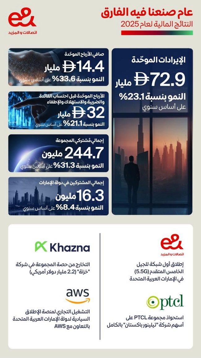 أعلنت مجموعة إي آند من أبوظبي نتائجها المالية الموحدة للسنة المنتهية في 31 ديسمبر 2025، مسجلةً أداءً استثنائيًا يعكس تسارع وتيرة نموها وتحولها الاستراتيجي إلى مجموعة تكنولوجيا عالمية متعددة الركائز، مع توسع لافت في قاعدة المشتركين وانتقال قيادي مرتقب على مستوى الإدارة التنفيذية.
